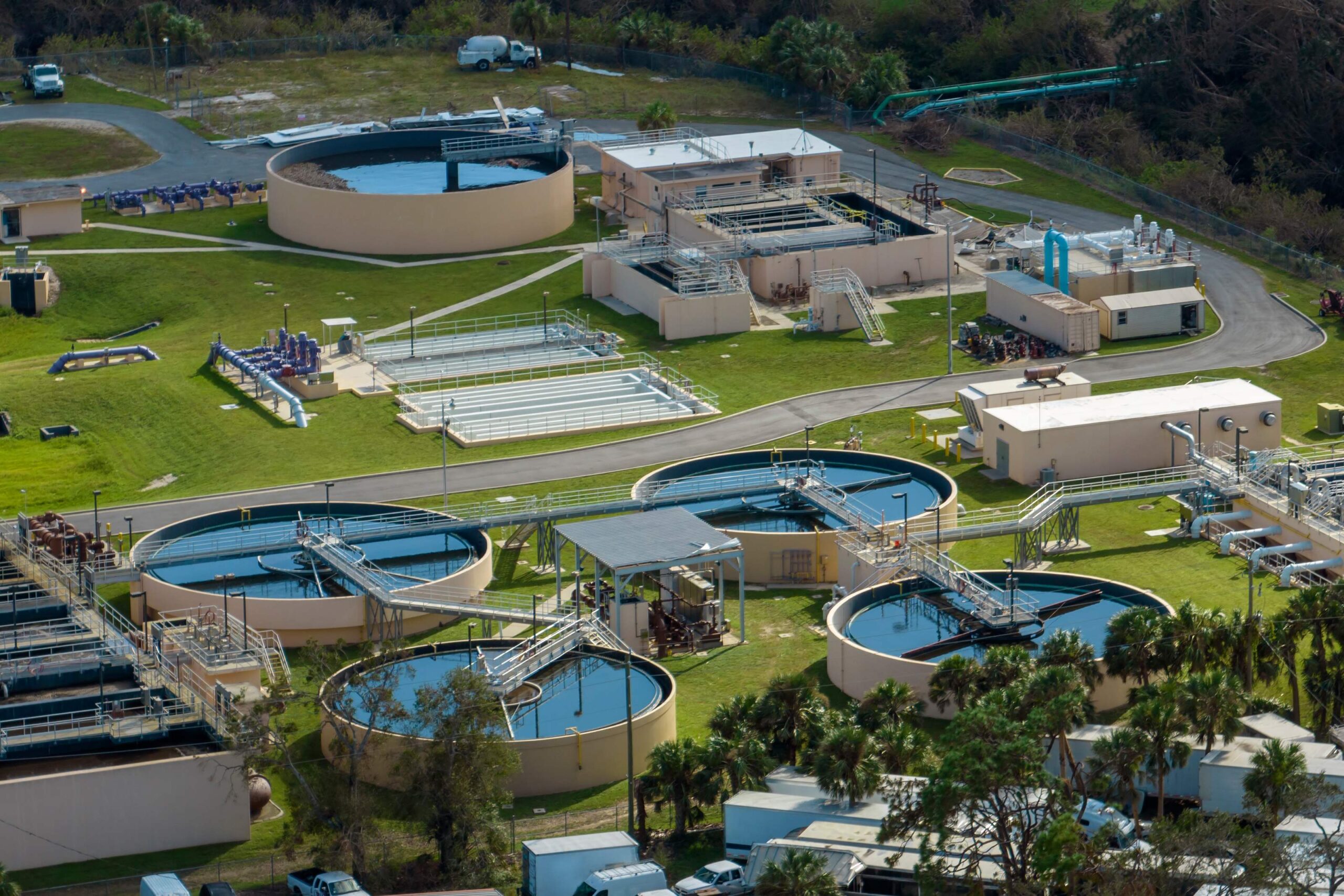 Industrial filters and pumps remove sand, debris, and particles to prepare the water for treatment.